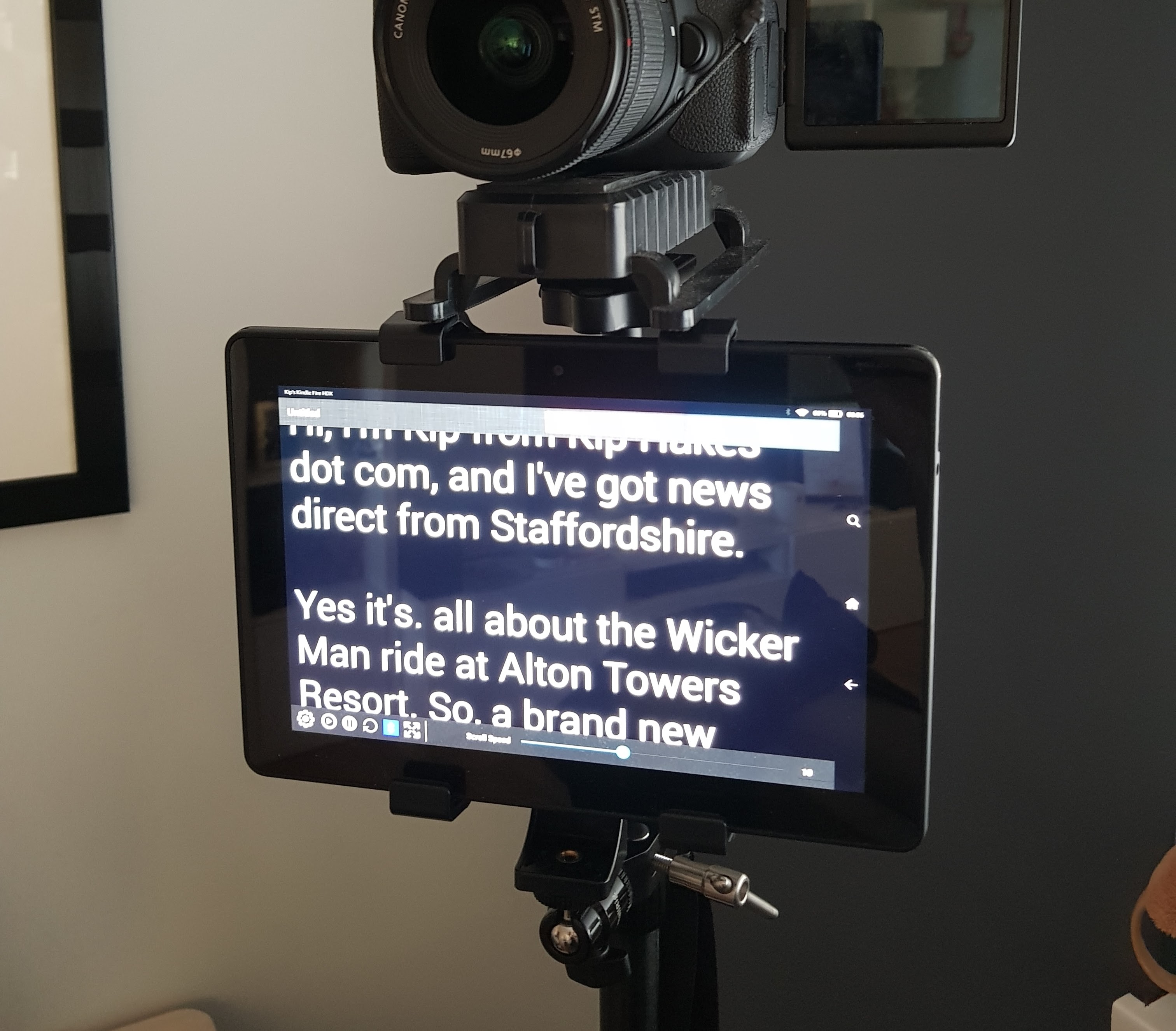 This is a bit of a Heath Robinson contraption made from this, and this. The MyArmor clamp holds the tablet onto the tripod. You can get several different autocue or teleprompter apps that will show a script on the screen. I just put a few key words or phrases in my ‘script’ to jog my memory. I might invest in a slightly more ‘pro solution‘ – but, I think I usually work better when improvising. Mostly!
